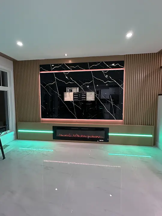 Bespoke media wall designs with integrated fireplaces, architectural panels, LED lighting, and concealed wiring — engineered to complement modern living spaces.